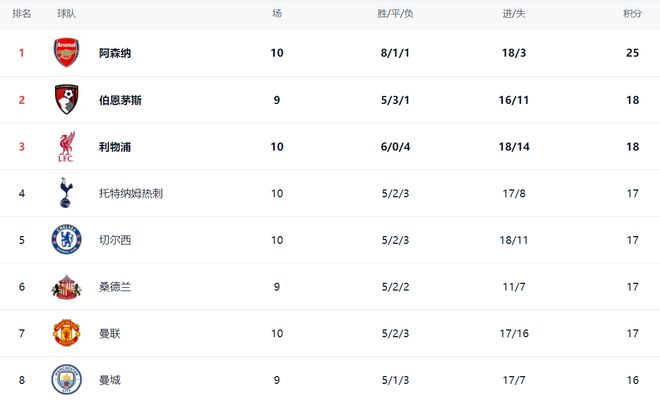 在積分榜上,阿森納是獨一檔的存在,拿到25分排名榜首。伯恩茅斯這匹黑馬以18分排第2。利物浦贏球之后,總積分也是達到18分,排名升到第3。熱刺、切爾西、桑德蘭和曼聯這4支球隊積分相同,都是17個積分。曼城踢了9輪,只拿到16分,排名第8。
